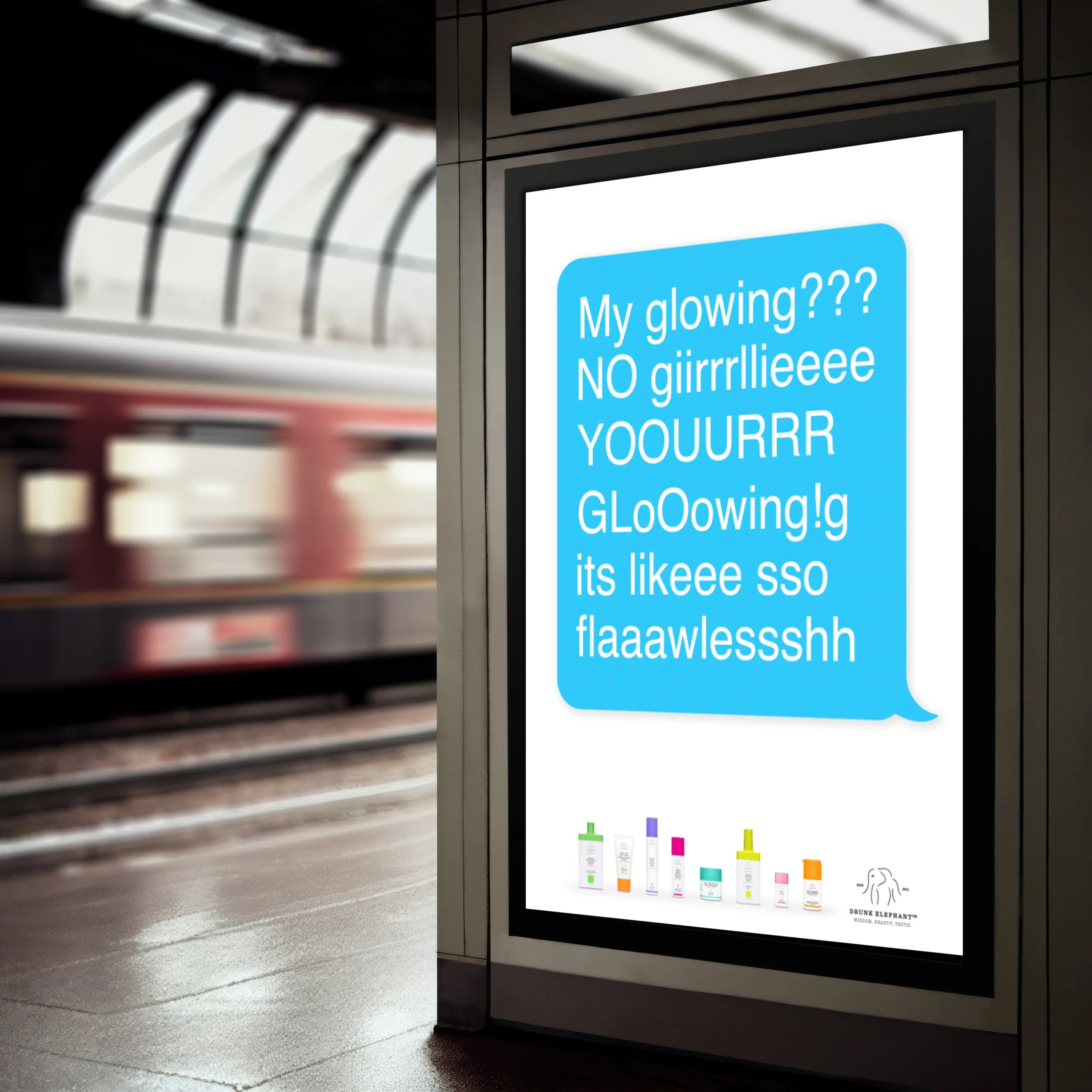 Wanna hear something funny? A drunk elephant with absolutely GLOWING skin. The truth is there are a quadrillion of skincare brands, but none are as memorable as this one. It’s beautiful, it’s wise, and it’s truthful. Challenged with this brand, we sought a solution, speaking truth and humor.